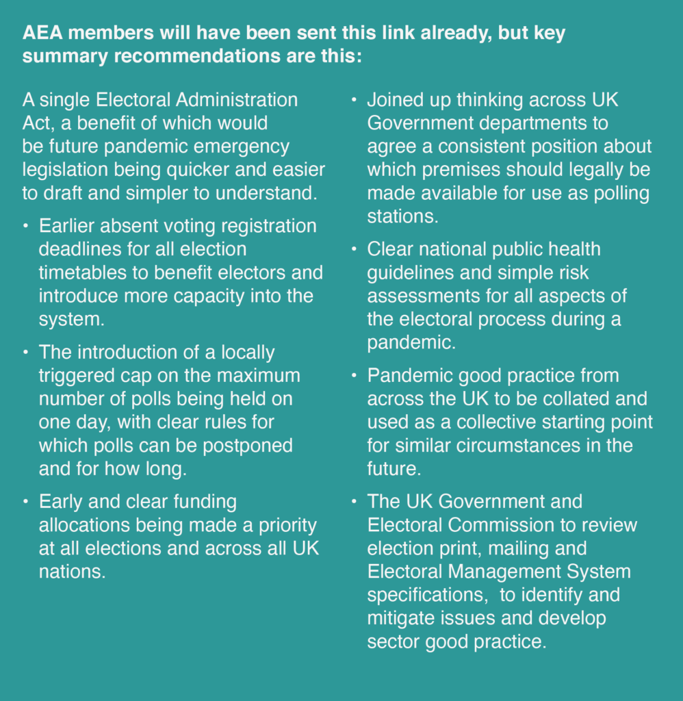 The AEA (Association of Electoral Administrators) has published a 2021 Post Polls Review, highlighting the difficulties of the May 6th election, its complexity and how Covid affected the Polls.